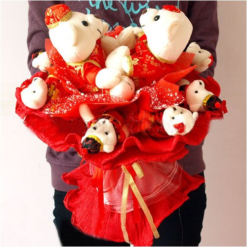 Buy Now! Forever Love Flower Bouquet of Dolls, 2 Big & 8 Small Bears in Tang Shirt